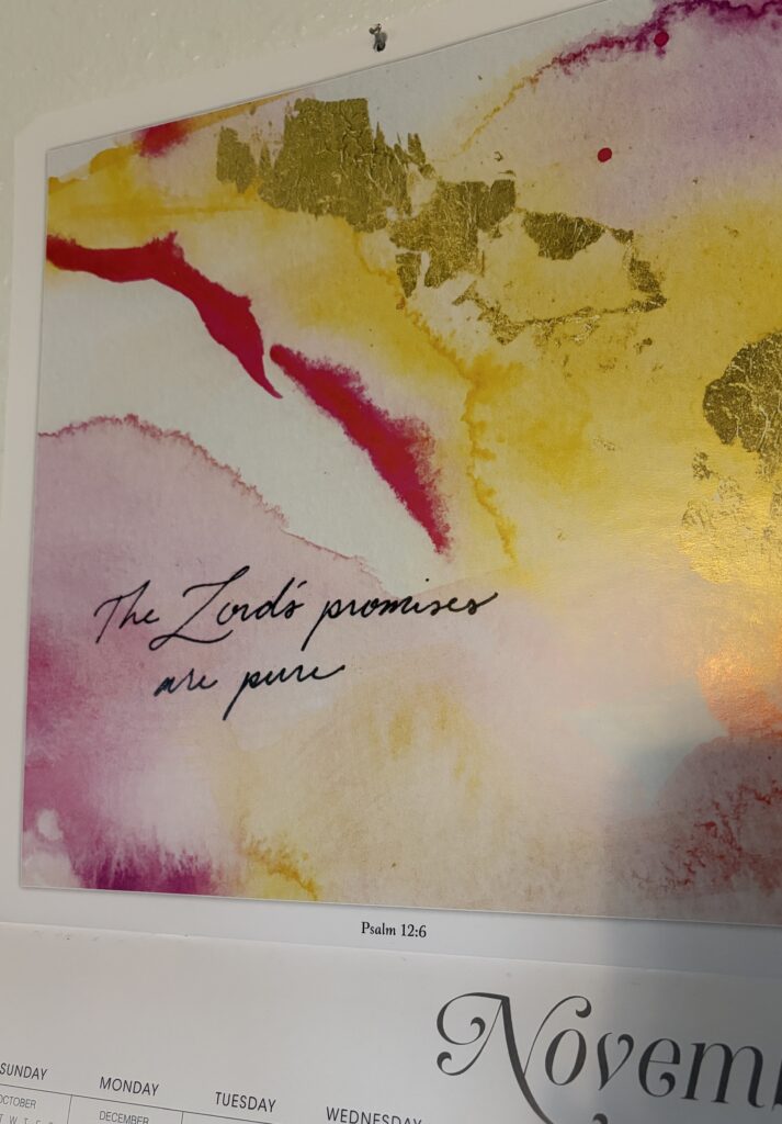 For decades now, I hang a calendar with monthly scriptures placed on beautiful art. It gives me a way to meditate on the word, get a quick reminder of truth, and sometimes a startling wake-up call. Last month, the verse was Psalm 12:6.  “The promises of the Lord are pure.”
